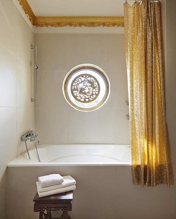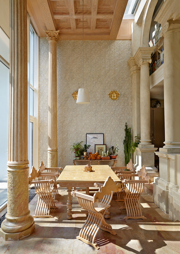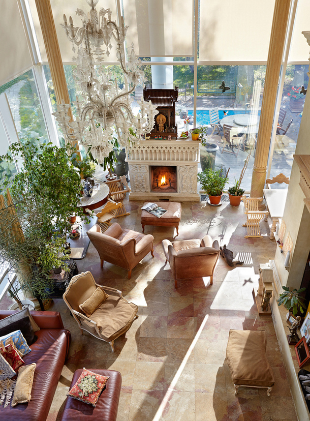 «Смысл этого проекта — один дом в другом, — объясняет хозяин. — Кусок стены заходит в интерьер, и здесь тема итальянской архитектуры продолжается. Высокое двусветное пространство, колонны, палладианские капители с Пегасами, кессонированные потолки, грифоны, поддерживающие кухонный остров». При этом в классическую оболочку заключено современное содержание: система «умный дом» управляет всей инженерией, светом, звуком и телевидением.