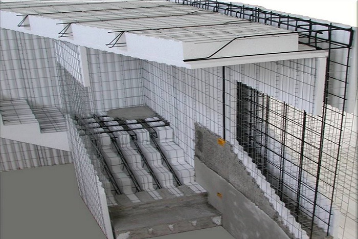 - Метод несъемной опалубки (Велокс). При этом опалубка остается на стенах. Для неё используется плиточный материал - фанера или в самом современном варианте — щепоцемент. Часть опалубки, относящаяся к наружным стенам, дополнительно утепляется плитами из полипеностирола. Помимо отличных теплоизоляционных характеристик, такой метод дает экономию на внутренней отделке — стены не нуждаются в дополнительном оштукатуривании и выравнивании.