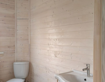 Гостиная наполнена ярким светом, в доме большие окна, высокие потолки. В санузле душевая кабина, мебель для ванной, унитаз. На полу ламинат.