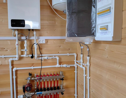 Магистральный газ(планируется), электричество(15 квт), канализация септик. Водопровод (скважина). Отопление. Электро котел. 1 этаж теплый пол. 2 этаж батареи.