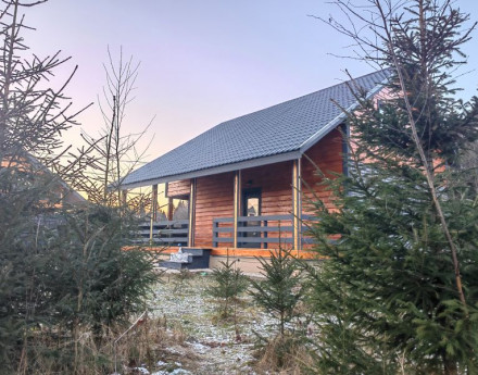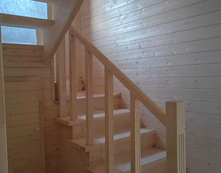 Фундамент - бетонная лента, построен из бруса 150 мм плюс утеплитель 10 см. Утепление крыши - 20см. Тёплые окна с двухкамерными стеклопакетами.