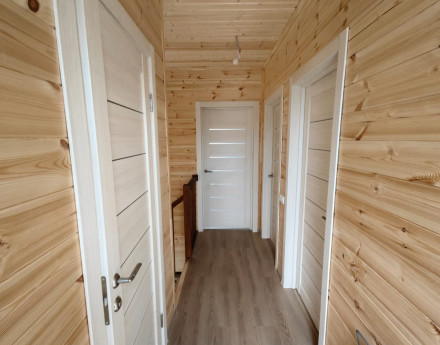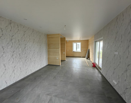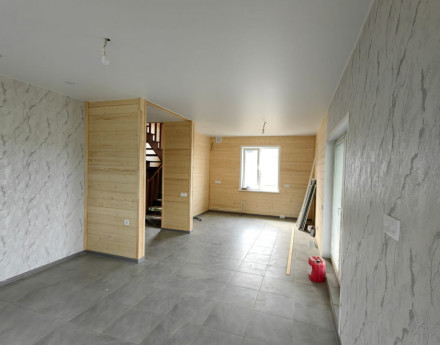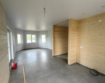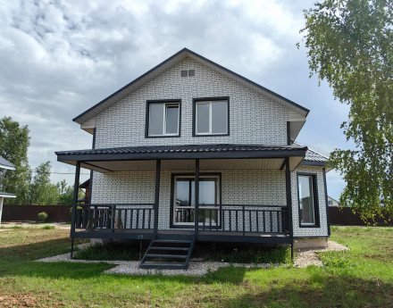 В доме большие окна. Теплый пол. Газ. Красивый современный дом из блока ( оба этажа), с отделкой "под ключ", площадью 160кв. м. на участке 15 соток В