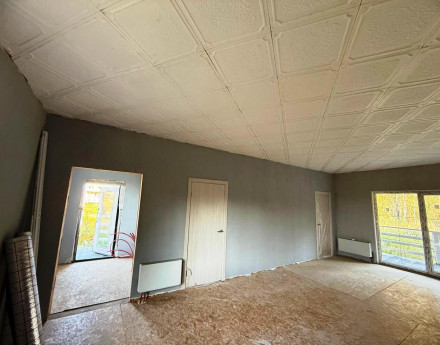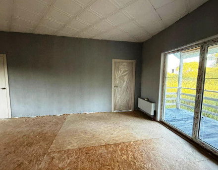 1 этаж общей площадью 89 м2 с высотой потолков 3 метра. Планировка: коридор с окном, кухня-гостиная 40 м2 с большими окнами и выходом на террасу, три полноценных больших спальни 14, 14 и 11 м2 с панорамными окнами и выходом на террасу и один санузел, в котором также установлено окно.
