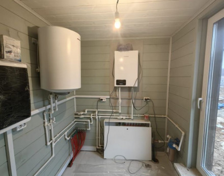-Коммуникации: Отопление – электрический котел, водяные теплые полы + радиаторы (тариф на электричество деревенский); Электричество – 15 кВт, 3 фазы, заведено в дом и разведено по точкам потребления с заземлением; Водоснабжение – скважина, заведена по-зимнему, с обогревом трубы;