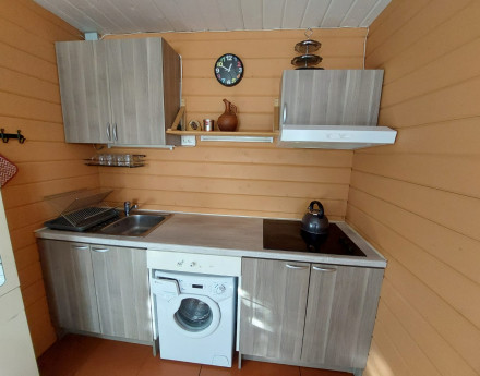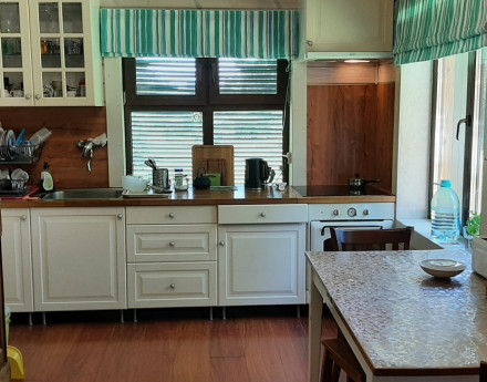 - кухня IKEA с духовкой, варочной панелью, посудомойкой. Совмещена с гостиной, общее пространство около 80 м² для семейных вечеров и праздников с печью и камином.