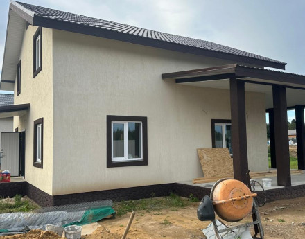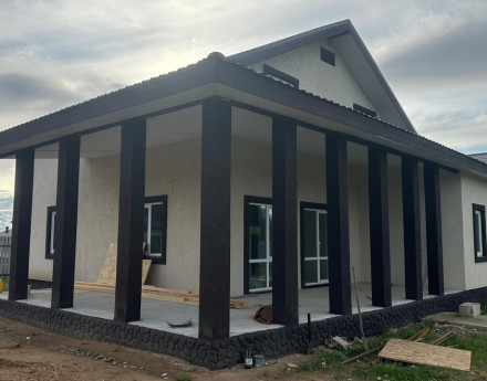 Фундамент - монолитная плита с теплыми полами. Материал стен - газобетонный блок с утеплением. Крыша - металл черепица. Окна: стеклопакеты - поворотно-откидные двухкамерные стеклопакеты с москитными сетками. Количество с/у – 2. Количество комнат – 5.Дополнительно: балкон, терраса.