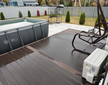 На участке дровяная баня, бассейн, качели, шезлонги.