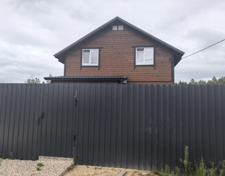 Забор с воротами и калиткой из проф. листа . Въезд для машины с площадкой 4 на 6. Круглогодичный хороший подъезд к дому.