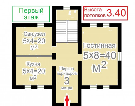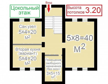 Кухня площадью 20 м2 (её можно переназначить в кабинет, например). Санузел 20 м2. Светлая гостиная площадью 40 м2 (которая может стать и кухней-столовой. По желанию).