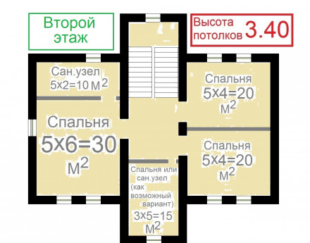 Две спальни по 20 м2 каждая. Санузел 15 м2 (который тоже можно переназначить в спальню).
