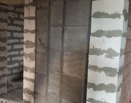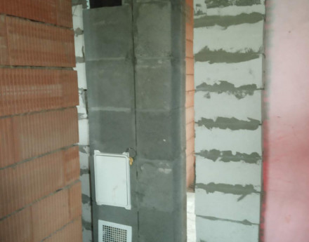 -На первом этаже: прихожая, кухня-столовая, каминный зал, кабинет, с/у, веранда с выходами из каминного зала и кабинета. Высота потолков 3м. В каминном зале установлен дымоход для камина совмещённый с вентиляционными каналами (от цокольного этажа до мансардного этажа – для каждого этажа свой канал – всего 4 изолированных вентиляционных канала) выведены через крышу( каналы и дымоход), облицованы кирпичом.