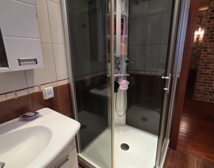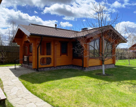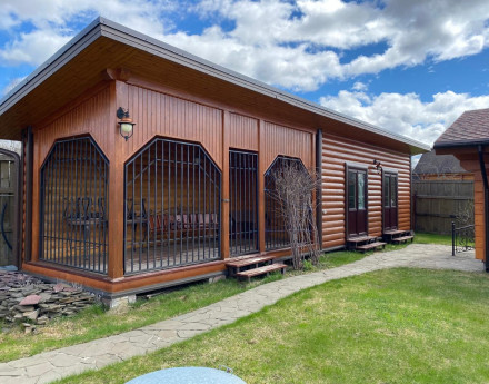 2. БАНЯ-шале из клееного бруса 200х350 площадью 66 м2 с чугунной печью-камином: просторная сауна/парная с закрытой каменкой, предбанник, помывочное отделение, комната с джакузи, мини-кухня, комната отдыха, санузел с душевой кабиной. Год постройки 2014. Для бани установлен газгольдер.