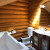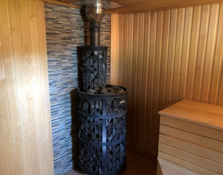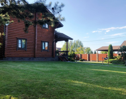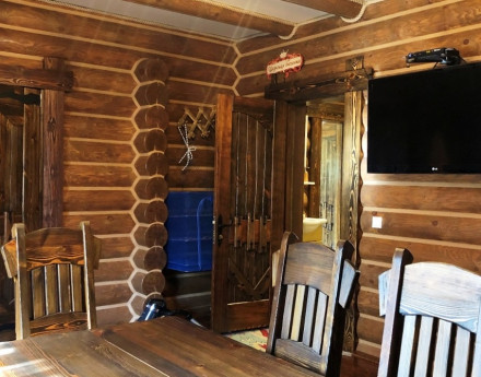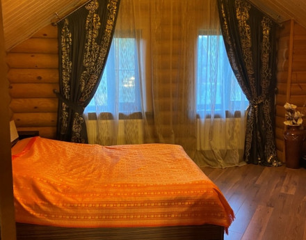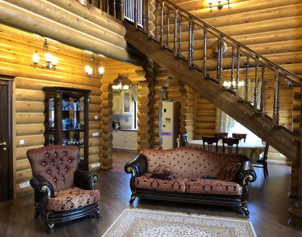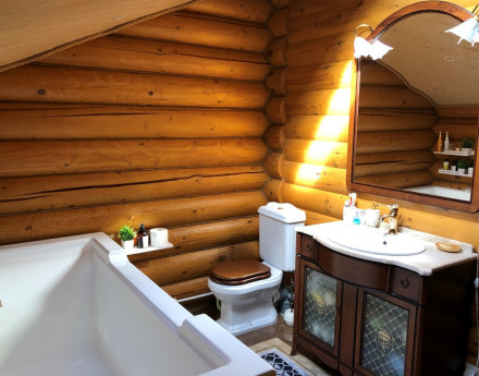 3). БАНЯ из оцилиндрованного бревна на фундаменте с подведенными коммуникациями. Внутри сауна, жилая комната, кухня, гостиная и санузел. От дома до бани проложена теплотрасса.