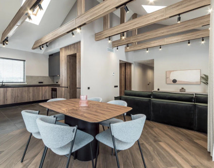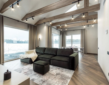 Архитектура и продукт: Единый стиль (Альтерум / Барн), панорамное остекление и высокие потолки.