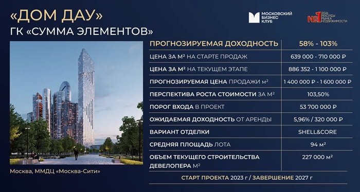 «Дом Дау» — уникальный жилой 340-метровый небоскреб с квартирами в «Москва-Сити». Он воплощает все стандарты премиум-класса, сочетая в себе авторскую архитектуру, престижную локацию, богатую инфраструктуру «вертикальной улицы», передовые инженерные решения и панорамные виды на 270 градусов.