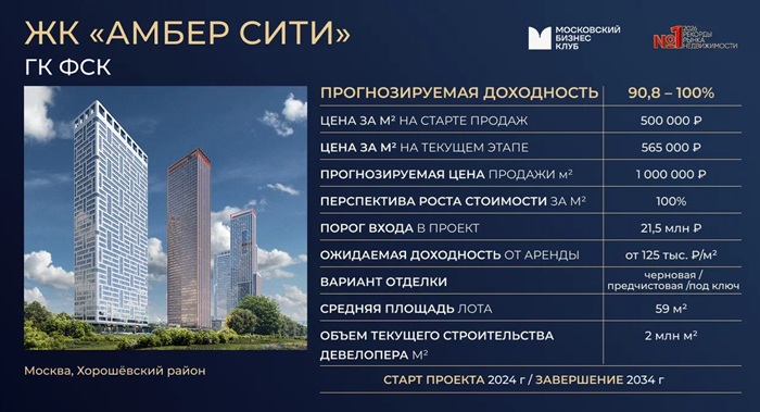 АМБЕР СИТИ — премиальный высотный квартал ГК ФСК в Хорошевском районе, в шаговой доступности от ст. м. «Беговая». В состав ЖК входят шесть футуристичных башен с приватной дворовой территорией, прогулочным бульваром и спортивным кластером. Здесь также появится образовательный комплекс, в котором разместятся школа и детский сад.