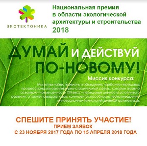 С 23 ноября 2017 года начался сбор заявок на участие в национальной премии в области экологического строительства и архитектуры «Эко_Тектоника-2018» - об этом было объявлено на проходившей в Сколково конференции, посвященной эко-строительству.