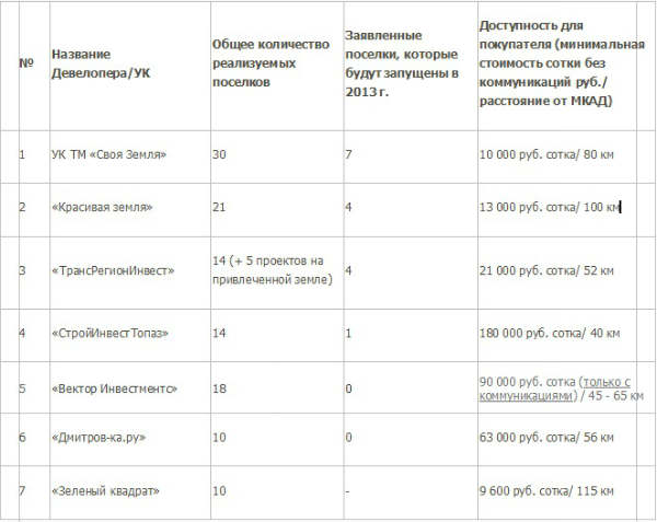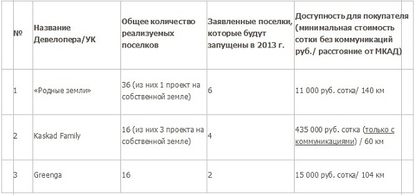 Более трети всего предложения на рынке (188 поселков без подряда) реализуется крупными компаниями, которые имеют в своем активе не менее 10 проектов. Основным критерием оценки было выбрано количество новых проектов, заявленных на текущий 2013 год. Кроме того, в таблицу включена графа доступности поселков для покупателей, которая определяет сегмент, в котором работают компании.