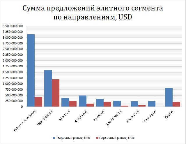 Если суммировать все элитные предложения по всем направлениям Подмосковья, получится около 10,015 млрд долларов, из них стоимость объектов первичного рынка составляет 2,525 млрд долларов, а вторичного – 7,490 млрд долларов.