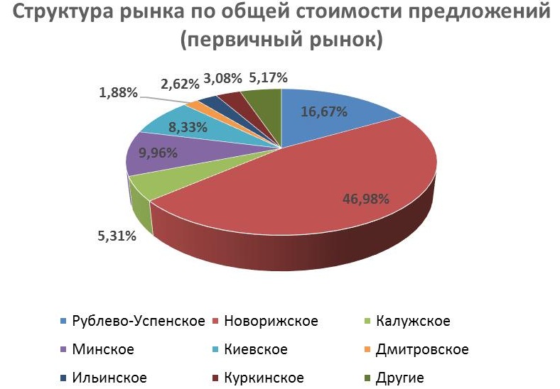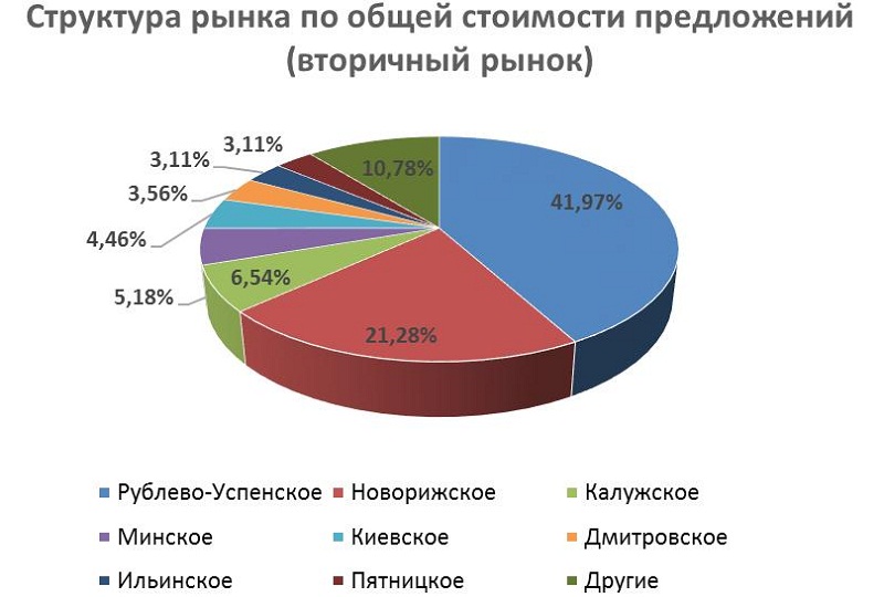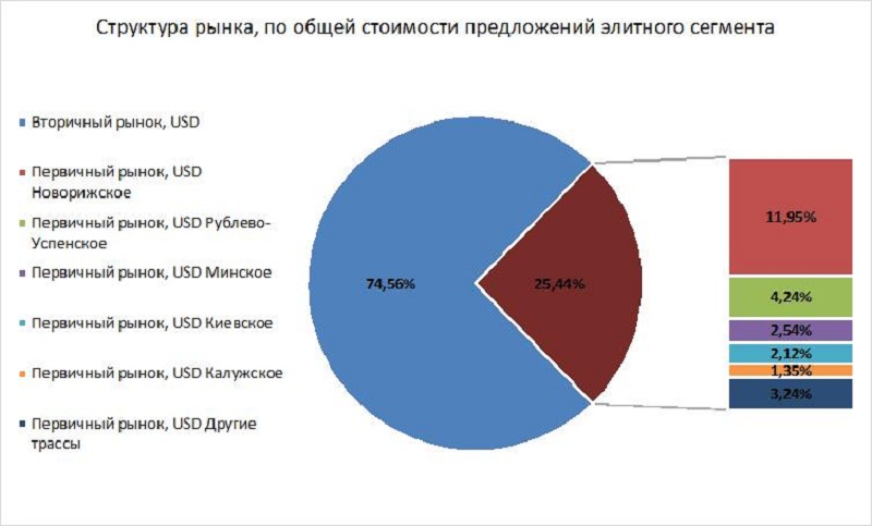 Первичный рынок – это лишь 25,44% от общей суммы, более половины – это стоимость объектов по Новорижскому и Рублево-Успенскому шоссе.