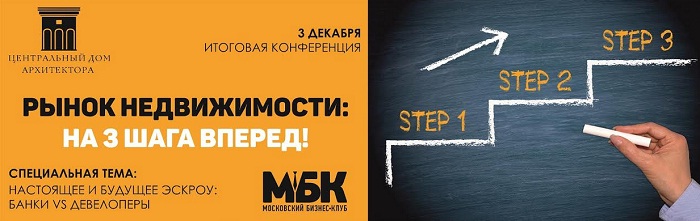 3 декабря Московский Бизнес Клуб приглашает Вас принять участие в ежегодной итоговой аналитической бизнес-конференции «Рынок недвижимости: на 3 шага вперед!» в Центральном Доме Архитектора. Специальная тема конференции: «Настоящее и будущее эскроу: банки VS девелоперы».