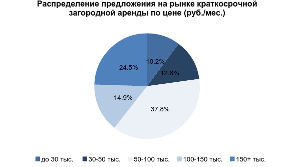 Самая большая доля предложения сегодня сосредоточена в диапазоне от 50 тыс. до 100 тыс. рублей в месяц – 37,8%. Что, конечно, делает загородный отдых не самым доступных для «широких масс». Возможно, спрос летом увеличится за счет тех жителей столицы, которые летали на отдых за рубеж.