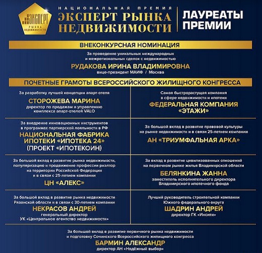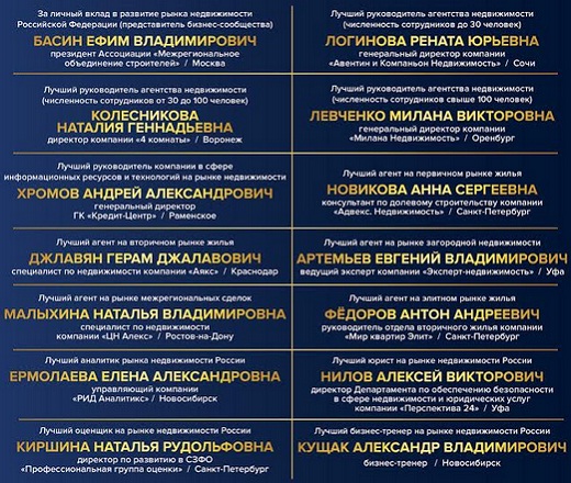 Напомним, что лауреатами премии становятся физические лица - руководители риэлторских и строительных организаций, агенты по недвижимости, главы компаний в сфере информационных ресурсов и технологий, а также маркетологи, оценщики, аналитики, бизнес-тренеры, юристы.