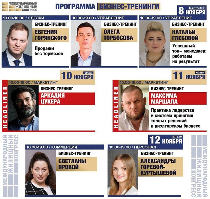 Хедлайнерами конгресса стали ведущий эксперт в сфере маркетинга АРКАДИЙ ЦУКЕР и один из самых популярных бизнес-тренеров в риэлторской сфере МАКСИМ МАРШАЛ. Они прочтут свои лекции, соответственно, 10 и 11 ноября. Обращаем внимание, что при покупке пакетов участия N1-5 вас ждут серьёзные скидки (до 50%) на мероприятия хедлайнеров.