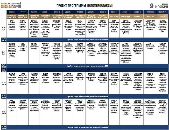 Во второй день конгресса, 9 ноября, состоятся 1,5-часовые мастер-классы. В общей сложности, пройдет 56(!) мероприятий. Все мастер-классы разбиты на 14 тематических линеек (управление АН, маркетинг, технологии сделок, новостройки, коммерция, элитная недвижимость, HR, digital и т.д.). Поэтому рекомендуем включать в делегацию от вашей компании специалистов по разным сегментам рынка. Проект программы мероприятий представлен на картинке и на сайте мероприятия.