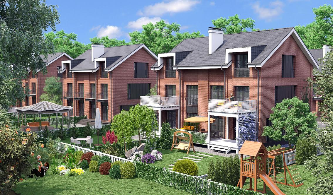 Поселок расположился рядом с лесом и озером. Территория застраивается кирпичными блокированными коттеджами на двух хозяев. Площадь домов составляет 150 или 180 кв. метров, размер земельного участка — от 3 до 6 соток.