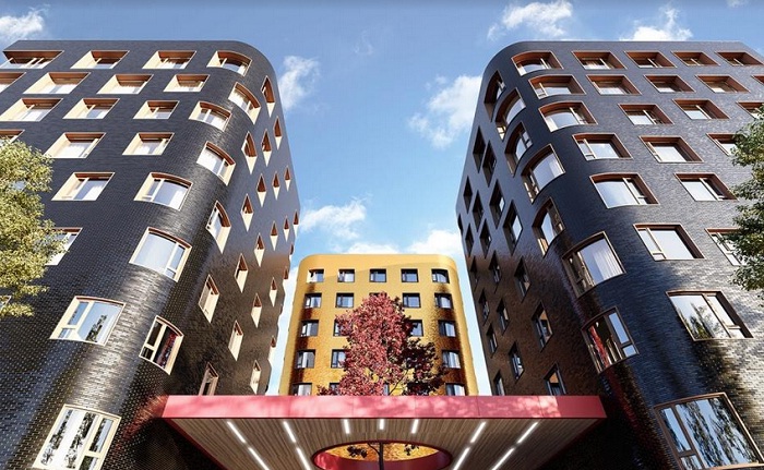 Архитектурный образ КОМПОЗИЦИИ № 24 — это три дома, соединенные единым арт-лобби и красным порт-кошером над главным входом. Отделка фасадов выполнена из черного глянцевого и золотого кирпича. Своеобразный триптих дизайнерских домов проекта составлен из имен ярких представителей авангарда: Александры Экстер, Наума Габо и Сони Делоне. А объединяющее их Арт-лобби — это пространство, лаконично вписавшее в свои интерьеры базовые каноны русского авангарда.