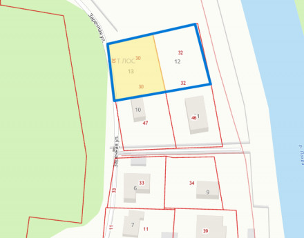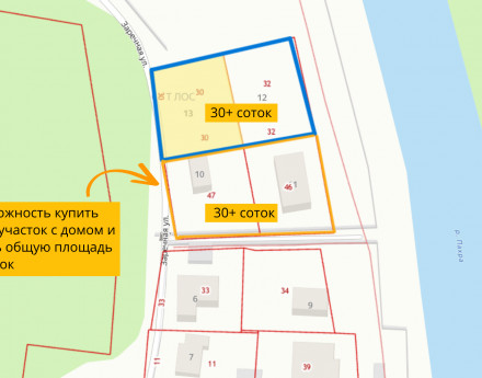 Общая площадь участков 30 соток, плюс, около 10 соток - это выход к реке к водоохранной зоне, к которой нет публичного доступа.