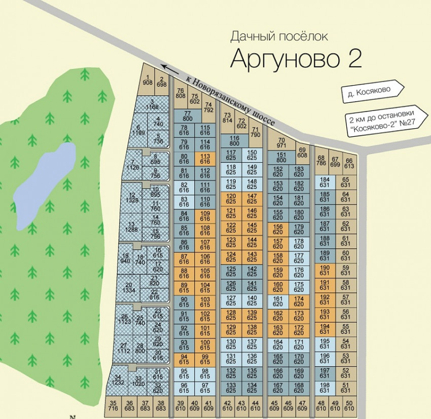 Поселок большой, застройка ведется в несколько этапов, в настоящее время выделено семь очередей строительства. Землевладения наиболее востребованного для дачного строительства формата реализуются без обязательного подряда.