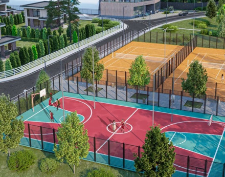 - Инфраструктура: spa, баскетбольная площадка, бассейн, беговая дорожка, гостевая парковка, детская игровая площадка, детский сад, зона отдыха, магазин, пляж, поле для минифутбола, ресторан, спортивная площадка, теннисный корт