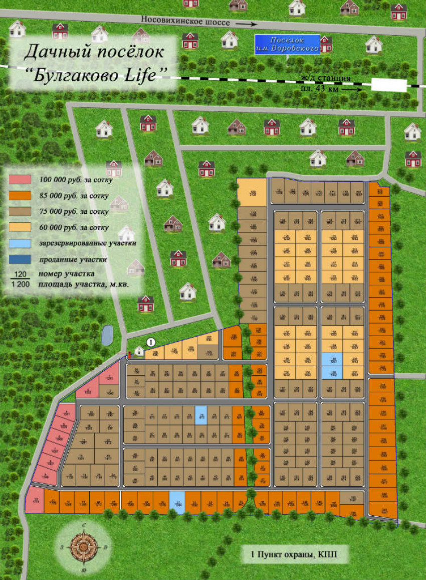 Поселок довольно большой — 243 землевладения размером 7-30 соток. Все необходимые документы готовы, обязательный подряд не предполагается. В поселок проведено электричество, проложены внутренние дороги, запланировано обустройство рекреационной зоны со спортивными и детскими площадками.