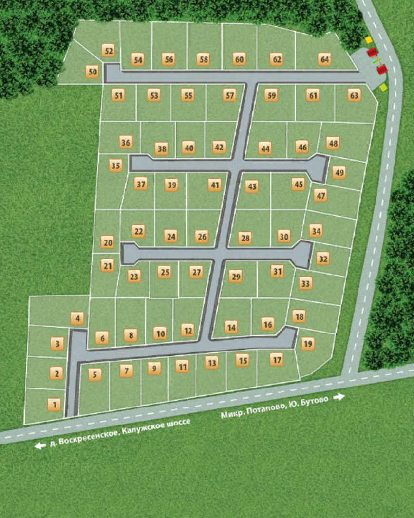 В поселке реализуются земельные участки без подряда от 8 до 14 соток с коммуникациями, а также коттеджжи на двух хозяев - дуплексы площадью 131 кв. м. на участках в 5,5 сотки. К поселку ведет хорошо асфальтированная дорога шириной 4 м.