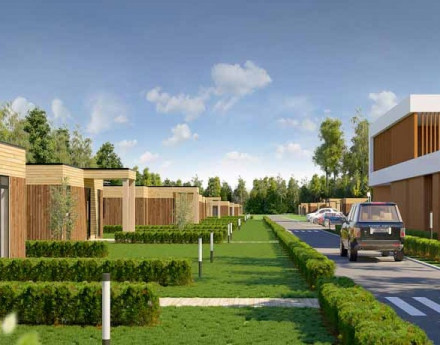 Поселок большой, территория в 35 гектар застраивается в две очереди современными модульными домами — стильный, оригинальный внешний вид, прекрасно вписывающийся в окружающую природу, экологичные материалы и высокая энергоэффективность.