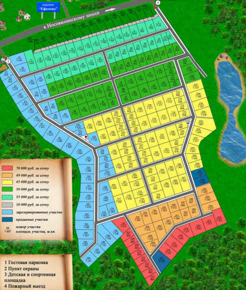 Обязательного подряда нет, но к строительству все готово: к участкам «Ефимовский лес» подведено электричество, обустроены внутренние дороги, территория огорожена и охраняется — попасть на нее можно только через КПП. Планируется строительство парковки для машин гостей и организация зоны отдыха.