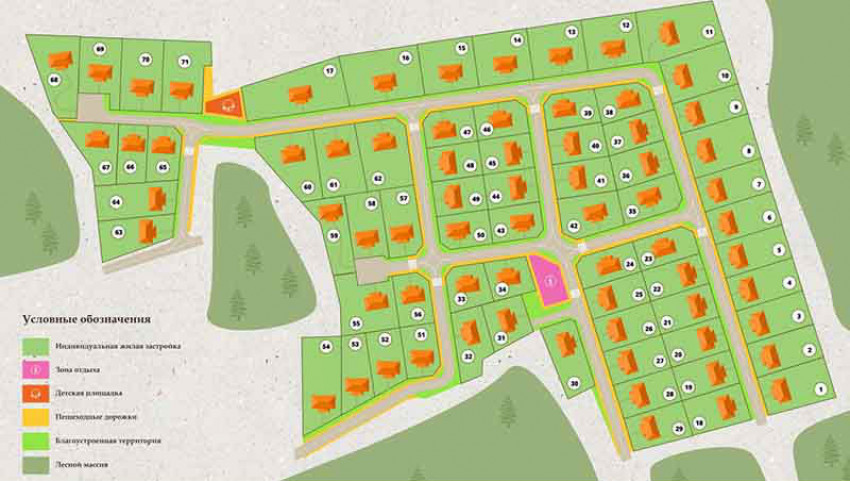 Поселок закрыт от посторонних — ограждение, КПП на въезде и круглосуточная охрана. Благоустройство включает большую зону отдыха, два детских городка и спортивную площадку.