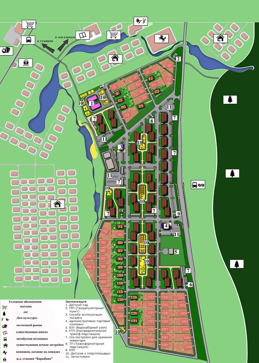 Поселок спланирован по всем правилам застройки городских и сельских поселений с учетом действующих нормативов градостроительного проектирования. Поэтому все объекты коммуникации расположены в строго отведенных им местах. Надо отметить, что ко всем участкам проведены нужные коммуникации, включая газ, электроэнергию, канализацию и водоснабжение.