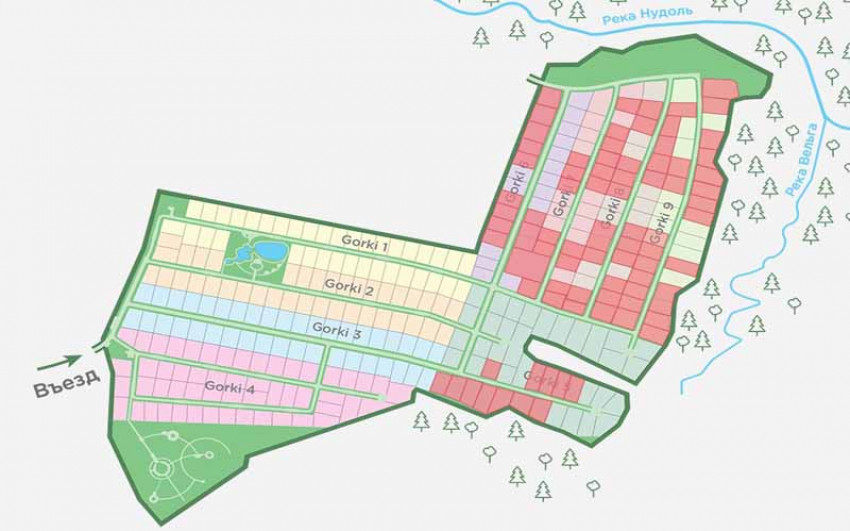 Место для поселка выбрано в лесном массиве в месте слияния рек Нудоли и Вельги. Размер землевладений начинается от 7 соток. Самые большие, до 20 соток, участки располагаются в прибрежной зоне.