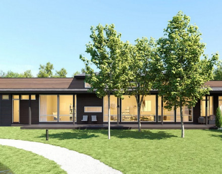 Почти треть поселка приходится на общественные пространства. Здесь предусмотрено офисное здание и клуб с сауной — они выполнены в общей стилистике проекта.