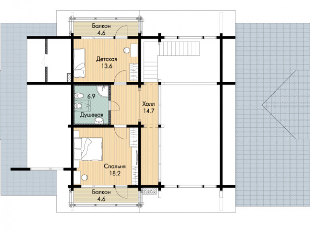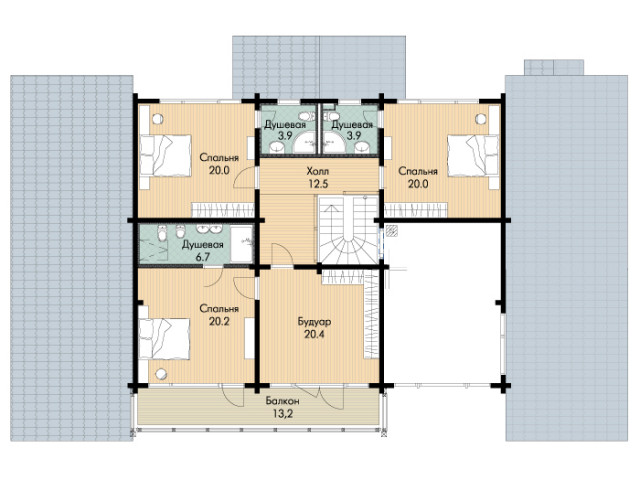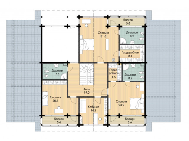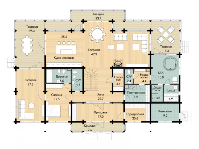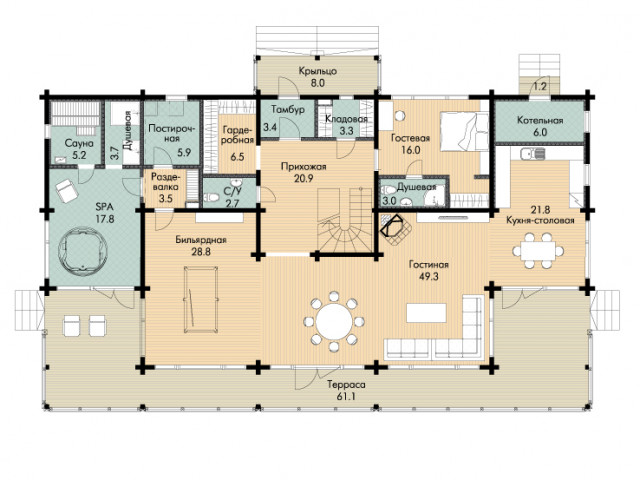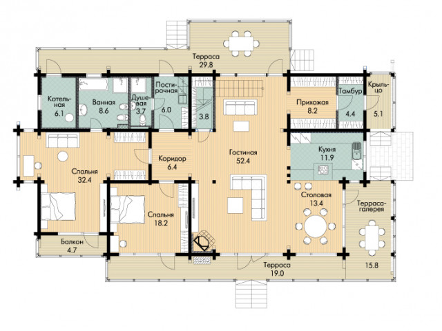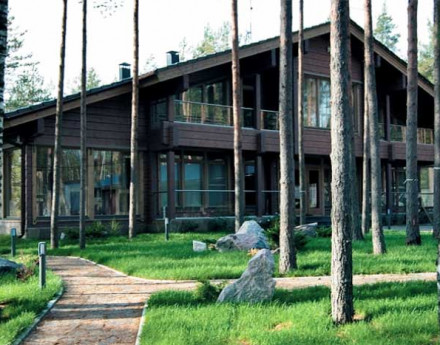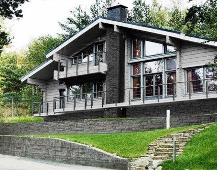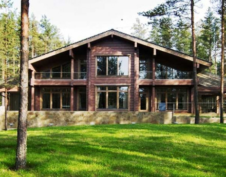 В каждом доме запланировано максимальное количество спален и санузлов. Все коттеджи двухэтажные, с террасами, с панорамным остеклением. Это традиционные дома в стиле «вежливой скандинавской архитектуры», со скатными крышами, окрашенные в теплые пастельные оттенки. Стеновой материал – профилированный шестиклееный брус.