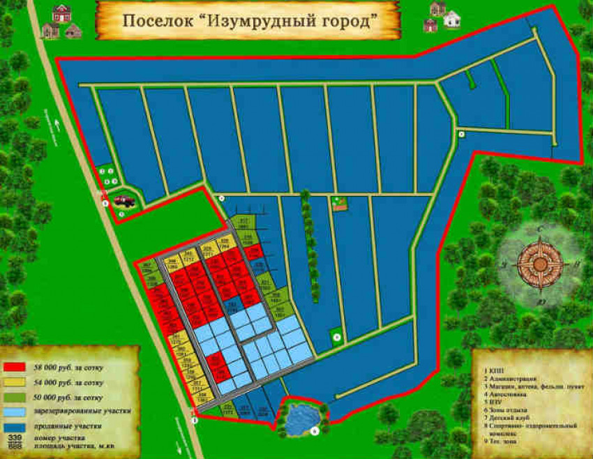 Территория поселка разделена на 367 участков наиболее востребованного в загородном строительстве размера — от 11 до 16 соток. К участкам «Изумрудный город» уже подведен магистральный газ и электричество, обустроены внутренние дороги, установлено общее ограждение, работает служба охраны — словом, все готово к началу строительства: обязательного подряда не предусмотрено.