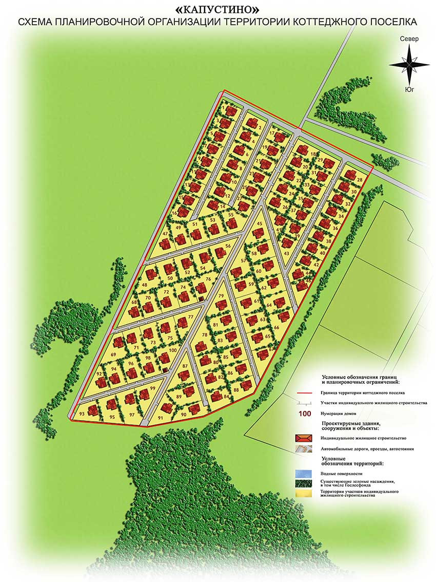 Территория его разделена на 100 участков, небольших - размер их составляет от 4 до 9 соток, но вполне достаточных для комфортного проживания за городом.