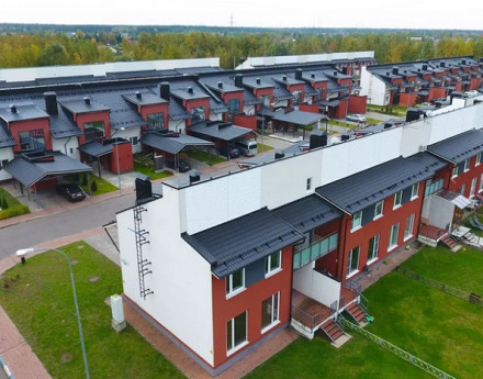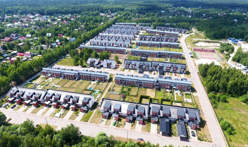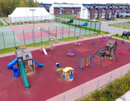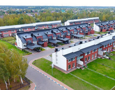 Закрытая охраняемая территория застроена двухэтажными кирпичными сблокированными домами, выполненными в современном европейском стиле.