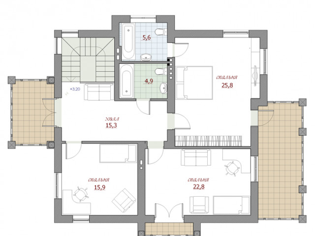 Предлагаемые проекты 2-этажных домов (их три, площадью 200, 236 и 250 кв. метров) отличаются стильным внешним обликом и продуманными планировками — просторные веранды, большие гостиные, уютные спальни. В каждом предусмотрен гараж на 2 автомобиля.