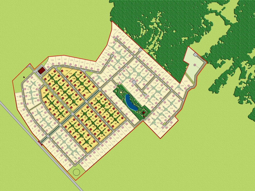 Установлено ограждение, работает охрана, готовы внутренние проезды, уличное освещение. В планах — большая рекреационная зона вокруг имеющегося в поселке природного пруда.