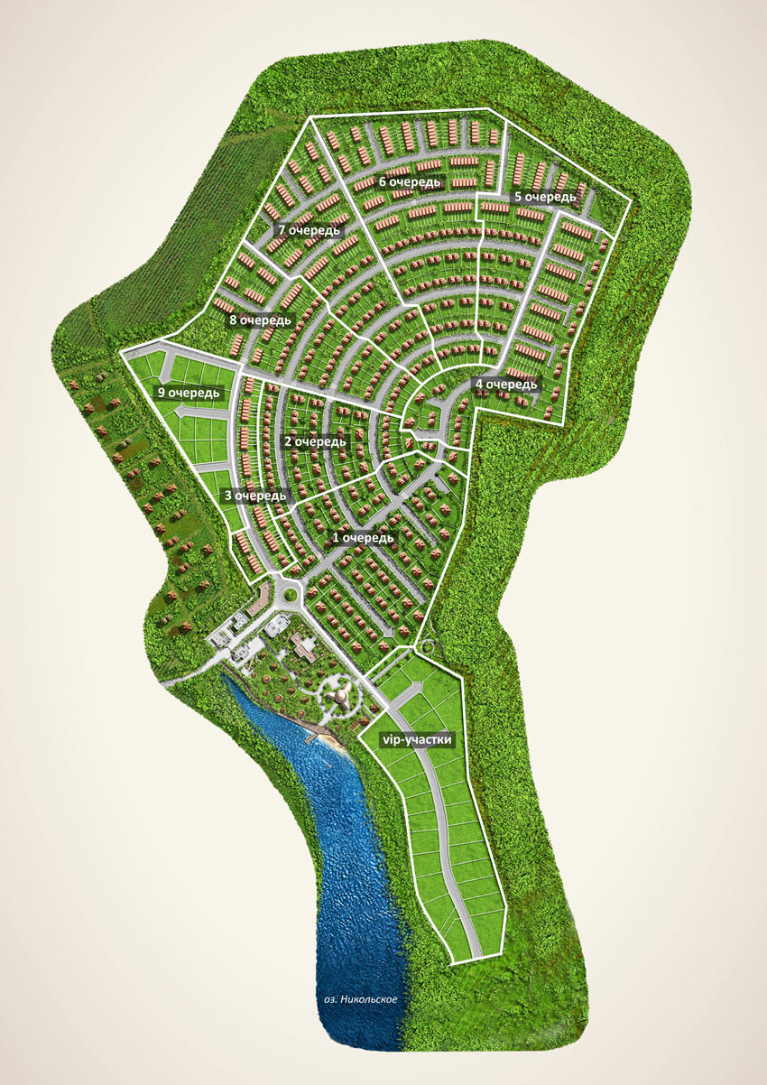 1. Расположение и экология: - 34 км от Москвы по Калужскому шоссе (30-35 минут езды) - Расположен в лесной зоне - Хорошая экология и чистый воздух - Близость к Никольскому озеру 2. Инфраструктура: - Несколько детских площадок - Собственный песчаный пляж - Набережная вдоль реки с причалом - Охраняемая территория 3. Благоустройство: - Качественное озеленение (много растений, деревьев, цветов) - Постоянное облагораживание территории - Чистота и порядок 4. Жилье и управление: - Качественное строительство домов - Эффективная работа управляющей компании - Умеренная квартплата - Разные форматы жилья (включая квадрохаусы с большими участками) 5. Социальные аспекты: - Сформированное сообщество жителей - Много семей с детьми - Сочетание городского комфорта с природной средой