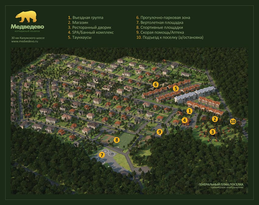 Коттеджный поселок "Медведево" расположен на 30 Га окруженных лесом. До поселка удобно добираться как по Калужскому, так и по Киевскому шоссе.
